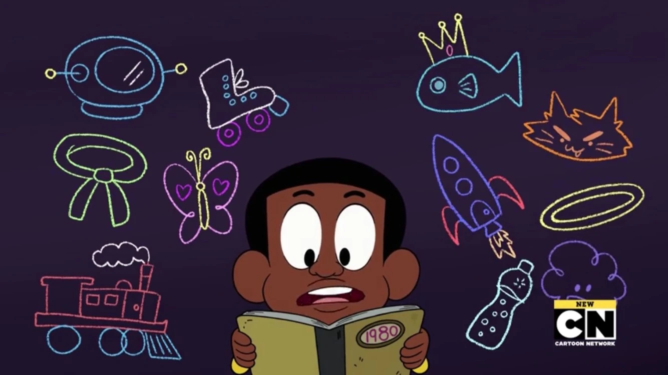 Craig reading the history of the war with symbols of the Kids fighting in the war (Left to right: the Space Cadets, the Roller Kids, the Green Belts, the Herkleston Model Train Society, the Butterfly Scouts, the Fish King, the Kitty Kids, the Rocket Club, the Hula Heads, the Fizz Boys, and Michael Bart).