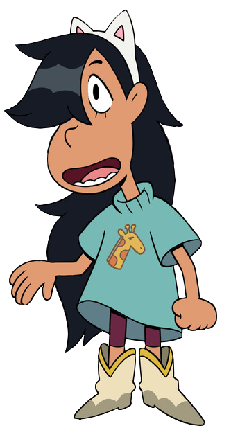 She wears a sky blue short sleeve shirt with an image of a giraffe on it, and wears magenta leggings and white cowboy boots with gold trim and grey heels. On her head, she wears a white cat ear [1] headband with pink inner ears.
